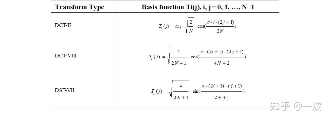 除了HEVC中的DCT-II变换,VVC引进了两种新的变换方式DST-VII 和DCT-VIII,帧内帧间编码块从这三种变换方式中进行选择。下表为三种变换方式的基函数。