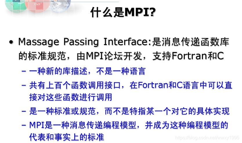 MPI是一个跨语言的通讯协议,用于编写并行计算机。支持点对点和广播。MPI是一个信息传递应用程序接口,包括协议和和语义说明,他们指明其如何在各种实现中发挥其特性。MPI的目标是高性能,大规模性,和可移植性。MPI在今天仍为高性能计算的主要模型。