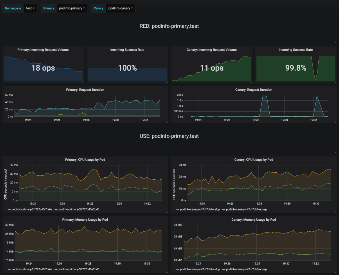 部署 rollout 通过 Canary 对象定义, 它会生成主要的和金丝雀 Deployment 对象。 编辑 Deployment 时,例如要使用新的镜像版本, Flagger 控制器将负载从 0% 切换到 50% ,每分钟增加 10% ,然后它将切换到新的 deployment 或者如果响应错误和请求持续时间等指标失败则进行回滚。