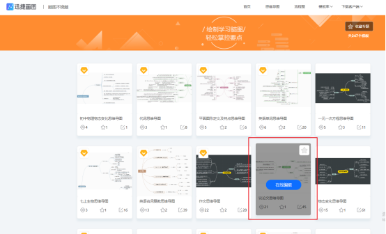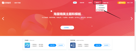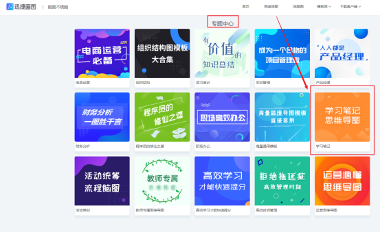 在迅捷画图的官网找到模板库,在模板库的下拉菜单中点击“热门专题,”进入专题中心页面就可以看到不同类别的模板块,在模板块中找到学习笔记,点击进入。