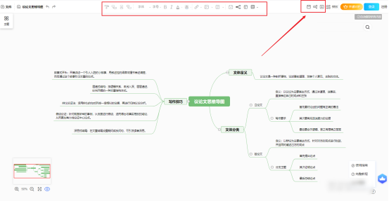 在学习笔记的分类中有很多学习相关的思维导图,选择我们需要的模板,进入在线编辑页面,以“议论文思维导图”为例,点击进入就可以看到已经绘制完成的模板。