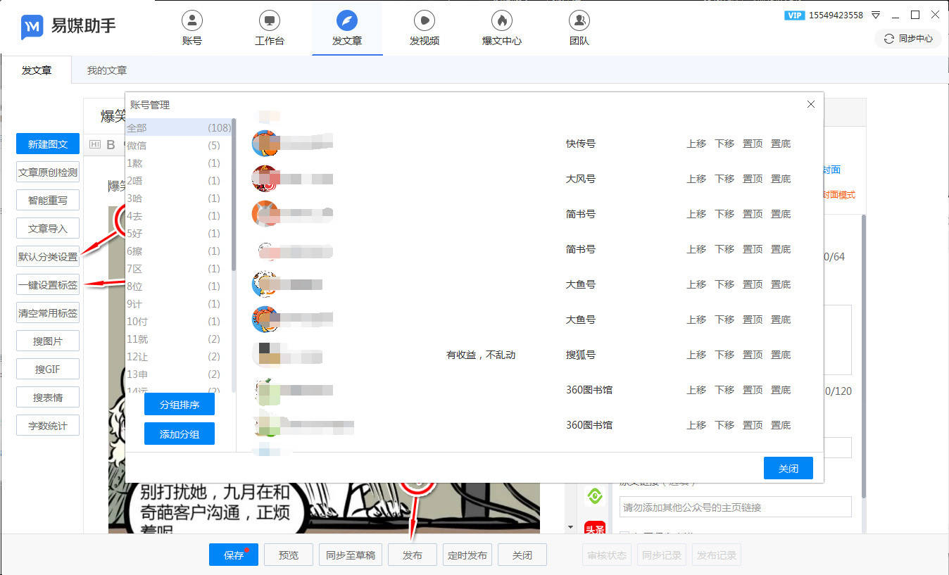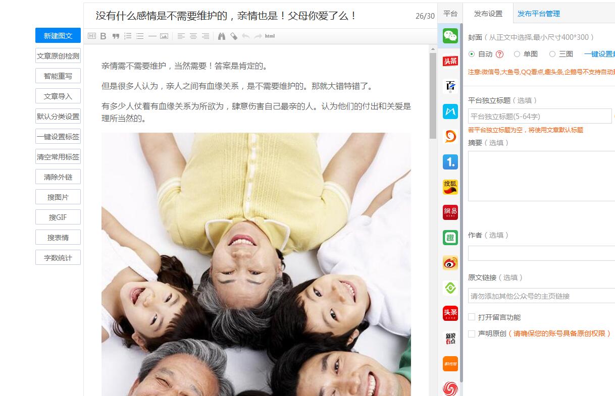 接下来准备发图文了,点击上方发文章,第一次用这个工具,那么最好设置默认分类,往后创作时自动选择你设置的分类,文章搞定后,点击一键设置标签按钮(左侧),再点击一键封面(编辑器右上角),倘若你某些平台单独设置一下,点击右侧对应平台设置一下就完成了,只剩最后一步点击发布了,点击发布按钮,进入发布界面,勾选要发的账号,就一键同步发送完成了。