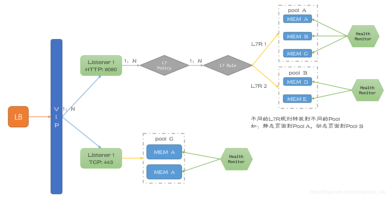 监听器,用户可通过其配置外部对VIP访问的端口,算法,类型等等。