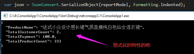 那怎么办呢? JsonConvert中提供了一个 Formatting.Indented 用来格式化json,这样在 debug 的过程中就非常友好,改造如下: