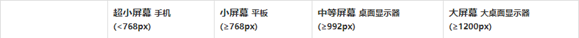 - 媒体查询:CSS3 媒体查询可以让我们针对不同的媒体类型定义不同的样式,当重置浏览器窗口大小的过程中,页面也会根据浏览器的宽度和高度重新渲染页面,但如何选择屏幕大小分割点也是一个需要考虑的要点, 比如我们可以划分:480px, 800px, 1000px 1400px。 我们可以参考参考 Bootstrap 这位老大哥是如何断点的:
