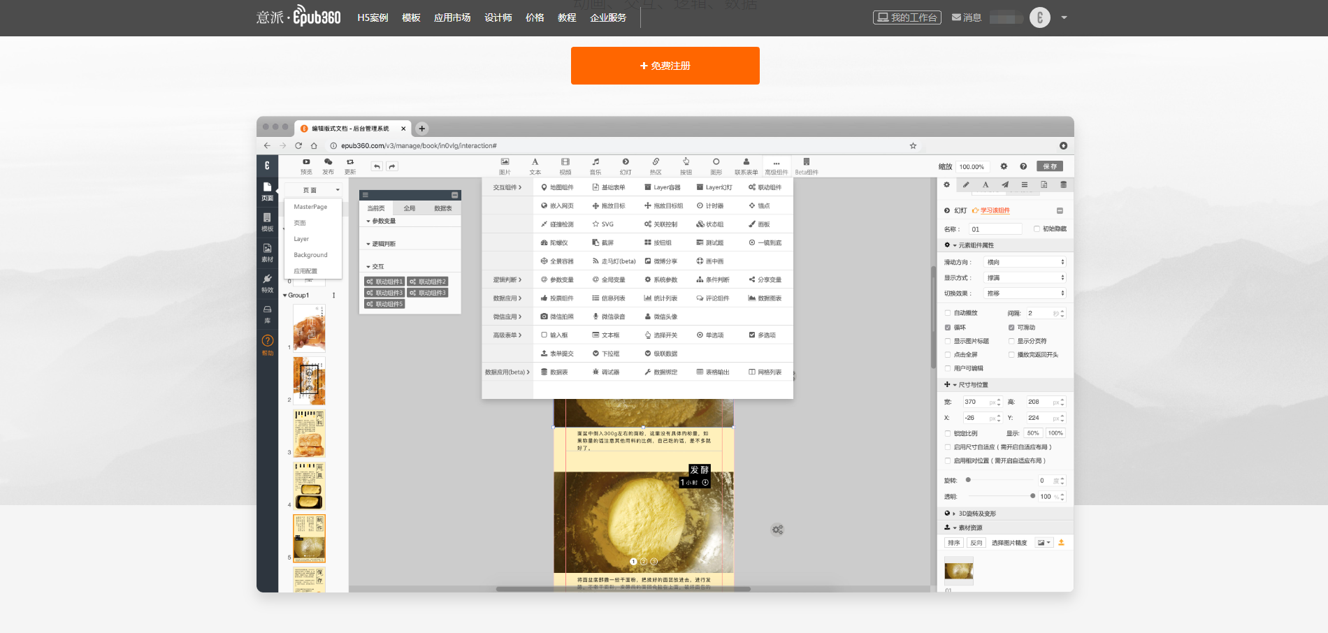 相比较而言,意派Epub360的性价比相对来说更高一些。这款H5制作工具适用于设计师、市场运营、文案策划等非程序员人群,且基础功能均可免费使用(如:基础表单、画中画、走马灯等)。它除了上传图文、音频、视频等基础功能外,还包括表单、数据库、参数变量之类的特色功能,可制作答题测试、一镜到底、模拟朋友圈等不同的创意型H5。