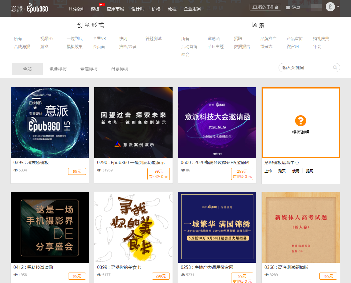 A:意派Epub360平台拥有非常丰富且专业的H5模板,这些模板主要按创意形式和场景进行划分。你可以先挑选一个喜欢的模板(模板分为免费模板、专属模板、付费模板),再进行编辑更改。