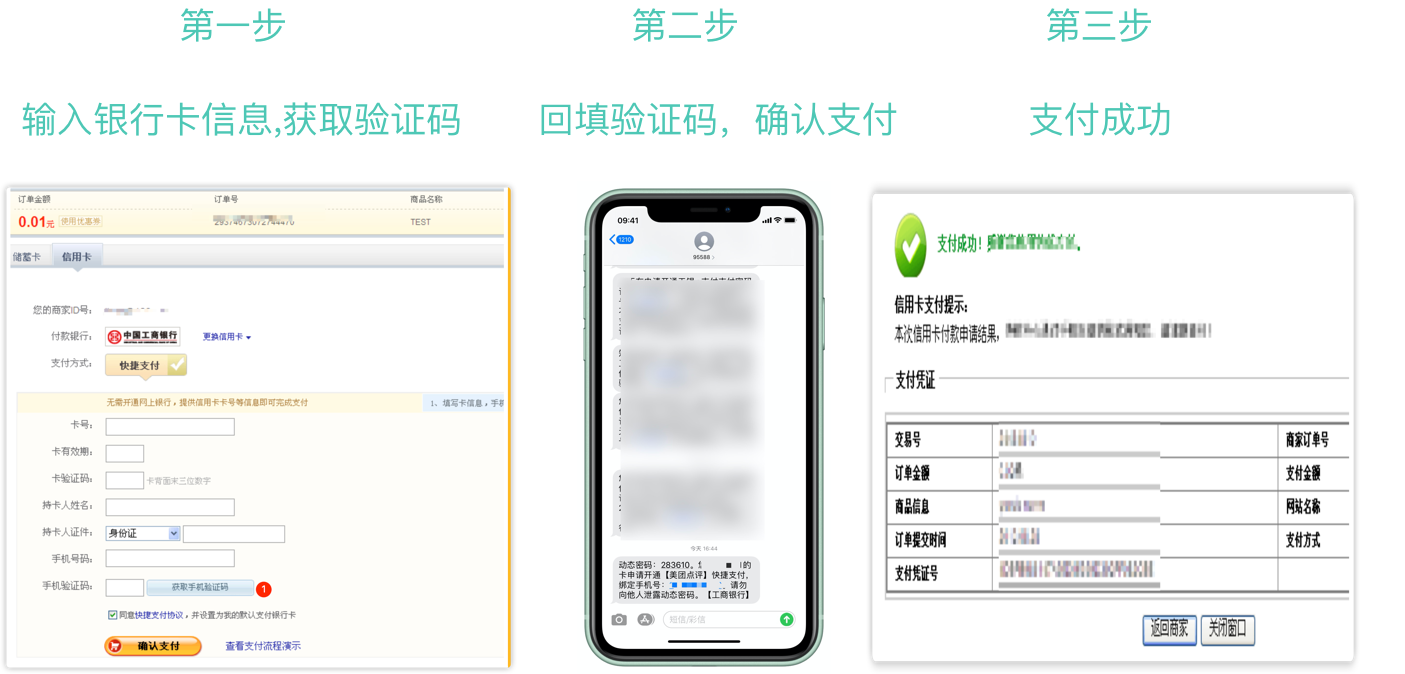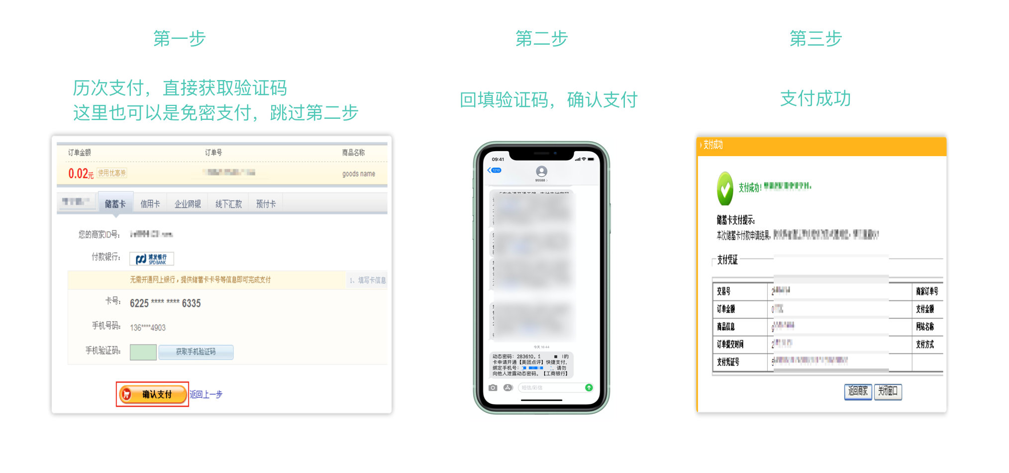 历次在电商网站下单支付时,由于电商网站已保存记录,所以无需再输入卡信息。历次支付流程如下: