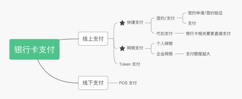 而线上支付分类就比较多了,根据银行卡类别,可以分为信用卡支付与借记卡支付。按照支付行为,我们又可以将其分为快捷支付,网银支付,Token 支付。