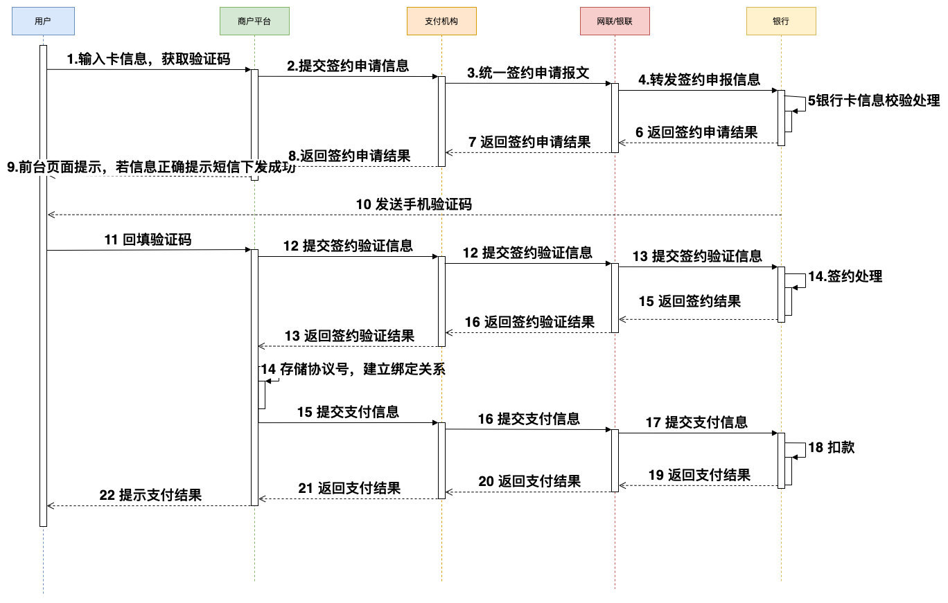 签约过程需要传入银行卡信息,银行卡号,户名,身份证号,手机号,信用卡的话可能还需要传入 cvv2 以及有效期。这个过程主要是为了鉴权,校验银行卡信息的正确性。