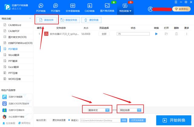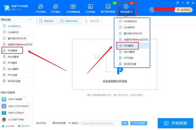 在软件页面中,我们可以看到各种功能,选择页面上方的特色转换,在特色转换中找到我们需要的“PDF翻译”选好之后,进行导入文件。