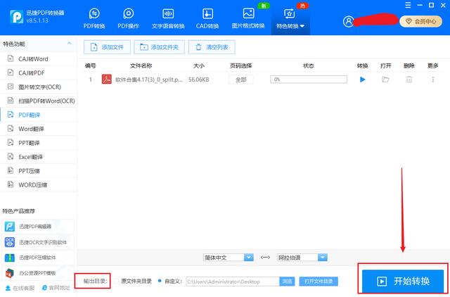 选好之后,调整输出目录,就可以点击右下角的“开始转换,”等状态下的进度条到达100%,PDF文件的翻译就完成了。