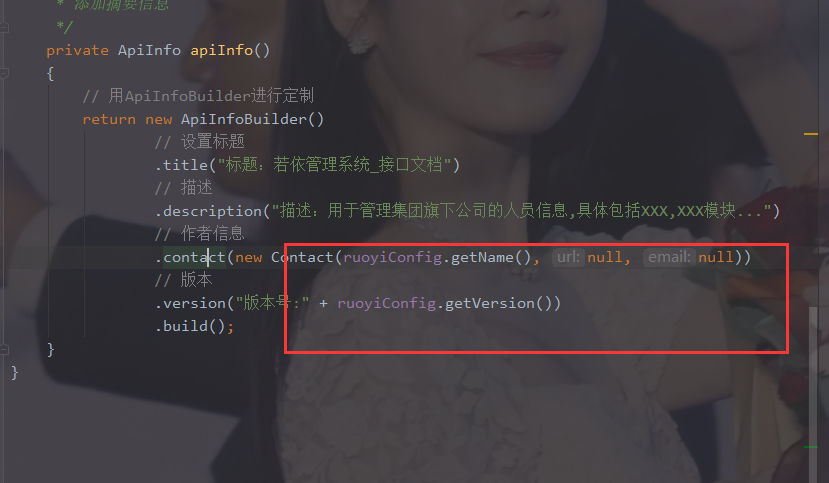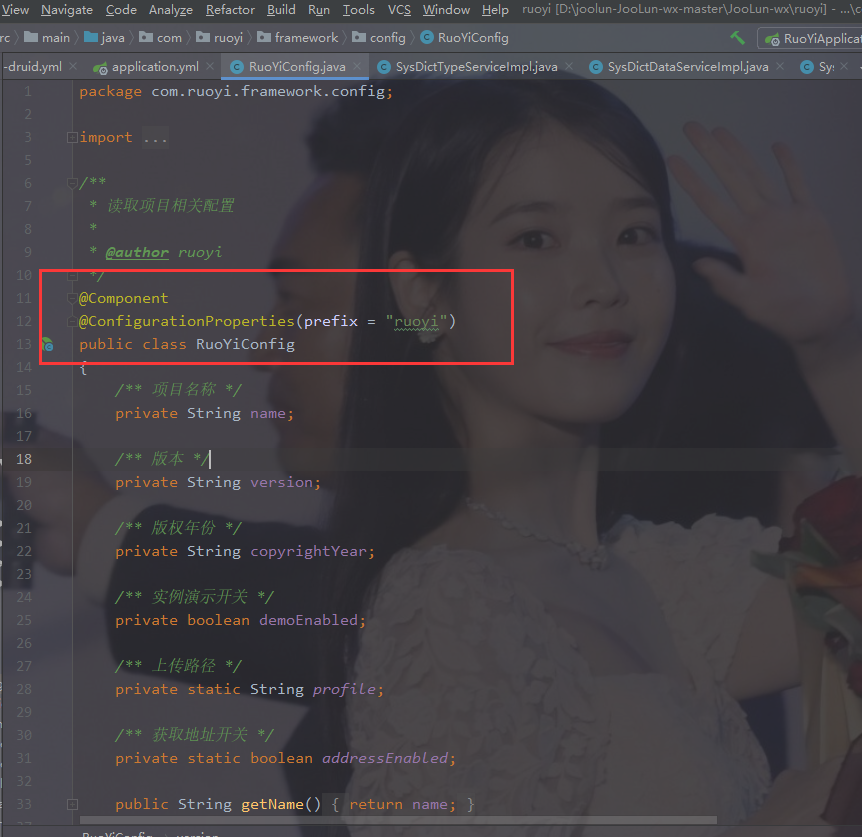 yml语法 @Component 表明为spring的一个组件 **@ConfigurationProperties(prefix = "ruoyi")**引用配置文件注入到实体类中使用 调用 来源:oschina链接:https://my.oschina.net/u/4079187/blog/4297384 标签 YML Spring BFE RuoYi
