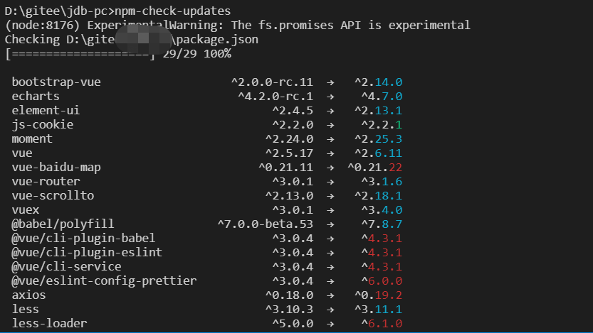 npm-check-updates或者ncu简写命令检查是否有更新(该插件会去npm官网查询是否有最新版本),如果有的话会出现下图所示的结果。