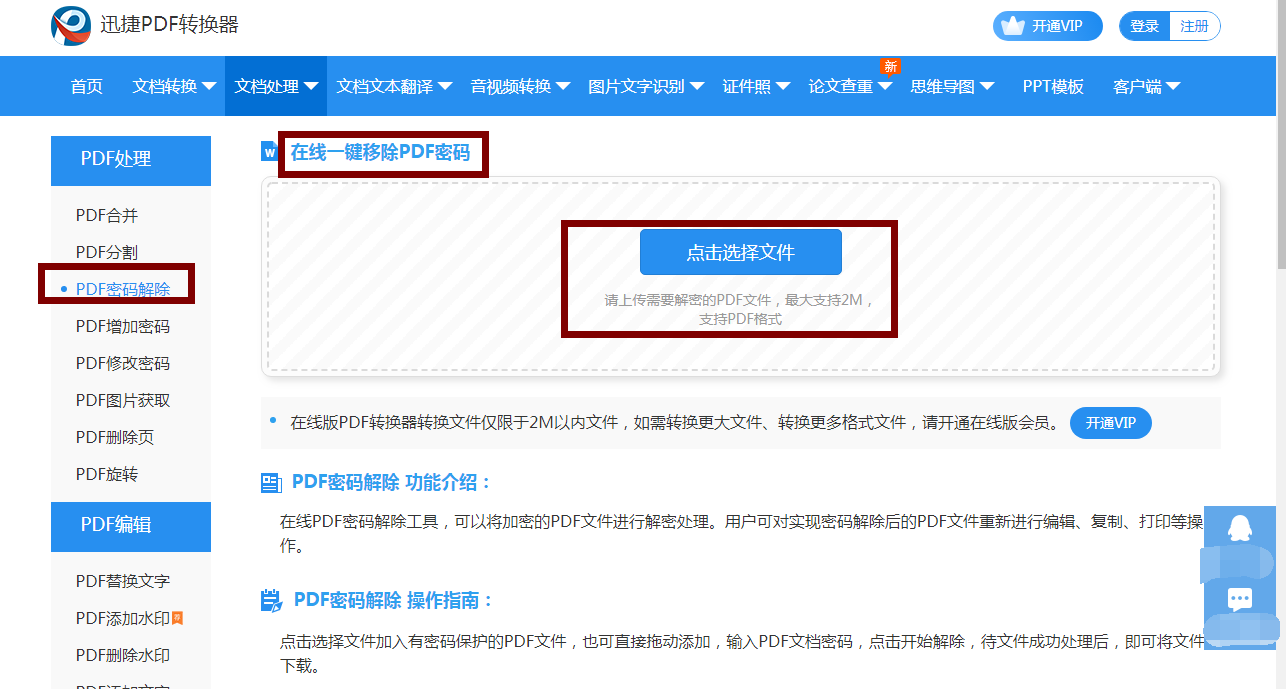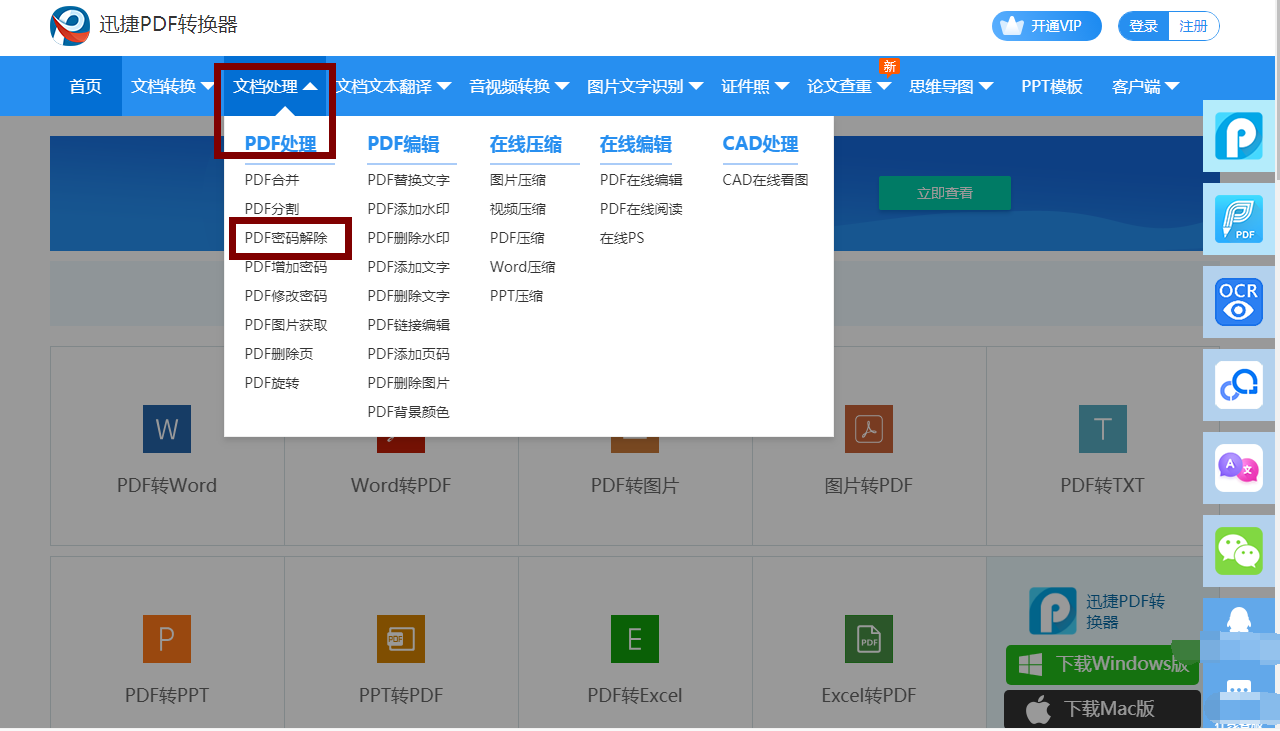 第一步:在百度上搜索“迅捷PDF转换器在线网站”,进入网页后,我们先后点击上方的“文档处理”—“PDF处理—”“PDF密码解除”。