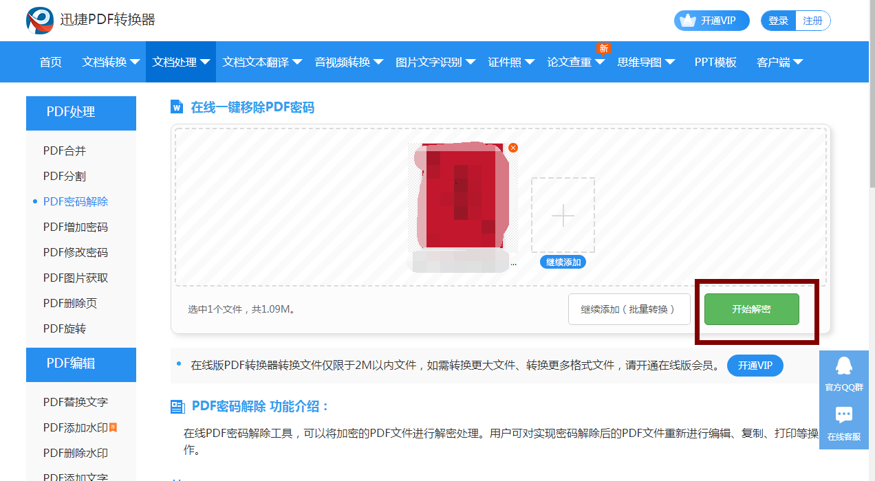 第三步:文件添加进来后,我们点击右下方的绿色按钮“开始解密”。解密完成后,我们就在刷新的网页里通过“分享”或“预览”进行查看,也可以点击获取二维码和立即下载这两个操作。