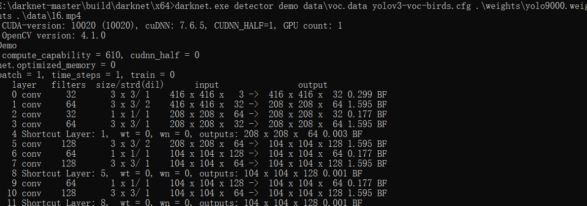darknet.exe detector demo data\voc.data yolov3-voc-birds.cfg .\weights\yolo9000.weights -c 1 //usb摄像头(0为自带)