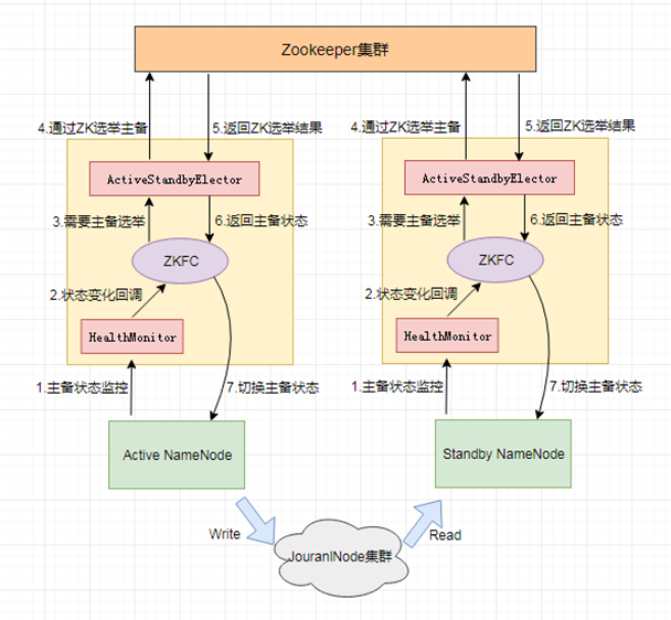 NameNode 主备切换主要由 ZKFailoverController、HealthMonitor 和 ActiveStandbyElector 这 3 个组件来协同实现: