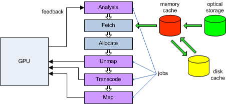 首先执行一个Feedback Rendering,或者从烘培好的Feedback Data中取出当前数据,然后分析需要加载的Page,尝试从内存中找到这个Page,如果没有,就从磁盘或者光盘中加载。然后申请一个新的物理纹理Page,在使用这个纹理之前,假如是之前用过的Page,我们需要先与GPU解绑。确定完之后,把这个Texture转换成一个GPU能用的压缩的Texture内容,并将这块Texture与GPU绑定。其中分析Feedback、Unmap、Transcode、Map过程是可以异步发生的,也就是需要一个Job System去驱动,他们的关系是生产者与消费者的关系。