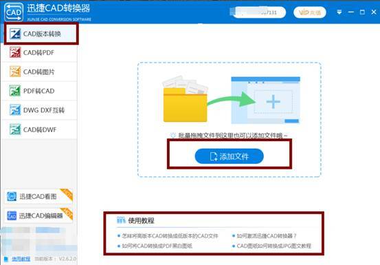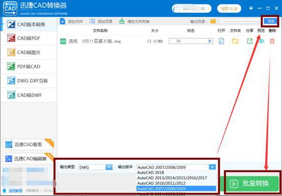 第一步:我们可以在百度上搜索“迅捷CAD转换器”,下载安装软件到电脑桌面上。打开软件后,进入到主界面,这时候我们看到左侧的功能选项里有一个“CAD版本转换”,点击进入后添加文件。