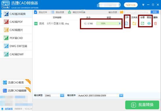 转换成功后,直接点击右侧的打开图标进行查看,在“打开”图标的右侧也有“分享”、“预览”等按钮。