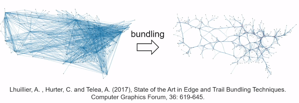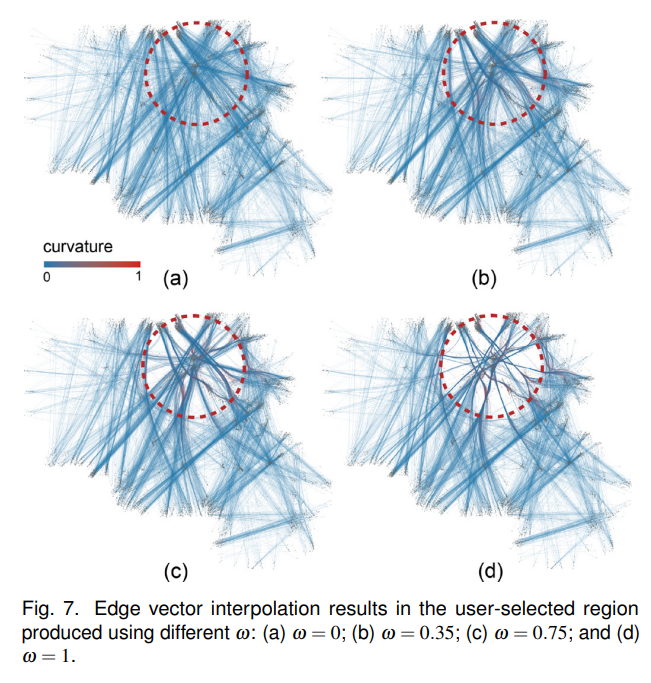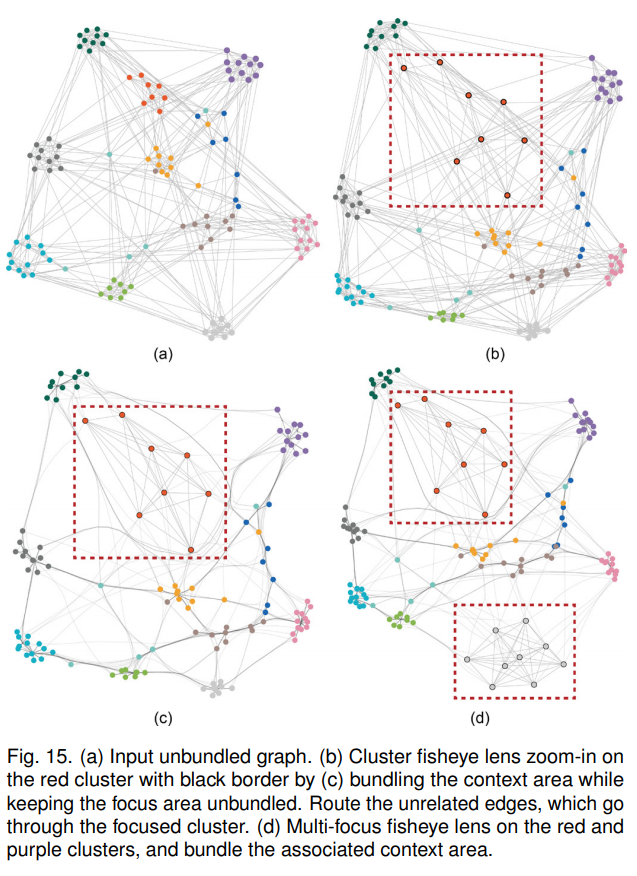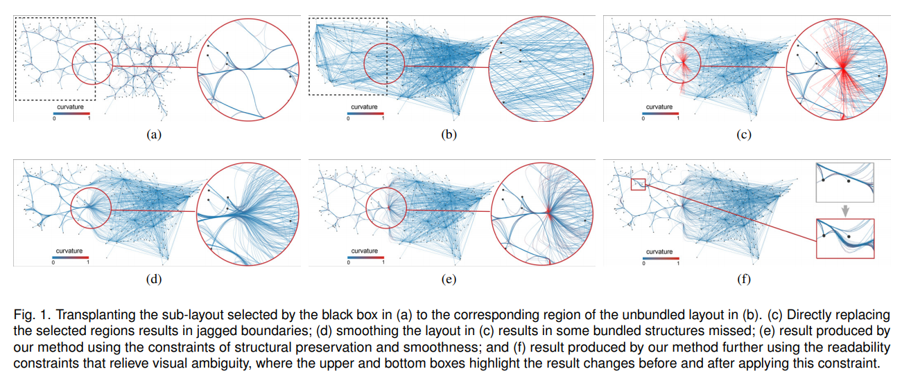 存在许多边捆绑技术(即简化数据以支持数据可视化和决策),但是它们不能直接应用于任何类型的数据集,并且它们的参数通常过于抽象并且难以设置。结果,这阻碍了用户创建有效的聚合可视化效果的能力。为了解决这一问题,我们研究了一种以任务驱动和以用户为中心的方法来处理视觉聚合的新颖方法。给定一个图形,我们的方法将产生一个杂乱的视图,如下所示:首先,用户研究不同的边绑定结果,并指定某些边绑定技术将提供用户所需结果的区域。其次,我们的系统然后计算这些指定区域之间的平滑且结构保留的过渡。最后,用户可以使用直接操作技术进一步微调全局可视化效果,以消除局部歧义并应用不同的视觉变形。在本文中,我们提供了设计原理和实现的详细信息。此外,我们展示了与当前的边捆绑技术相比,我们的算法如何提供更合适的结果,最后,我们提供了用法的具体实例,其中算法结合了各种边绑定结果以支持各种数据探索和可视化。