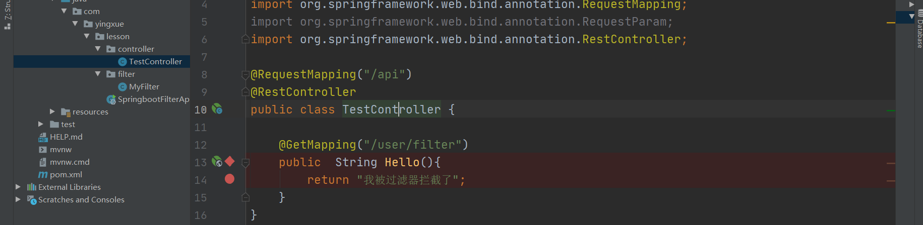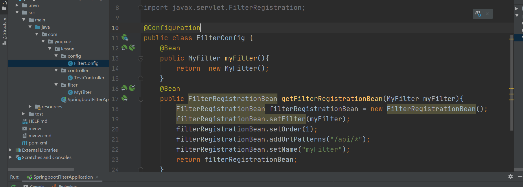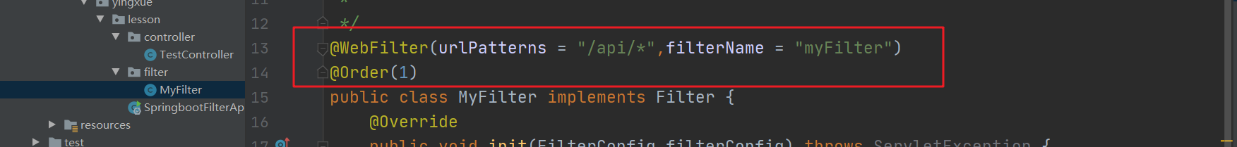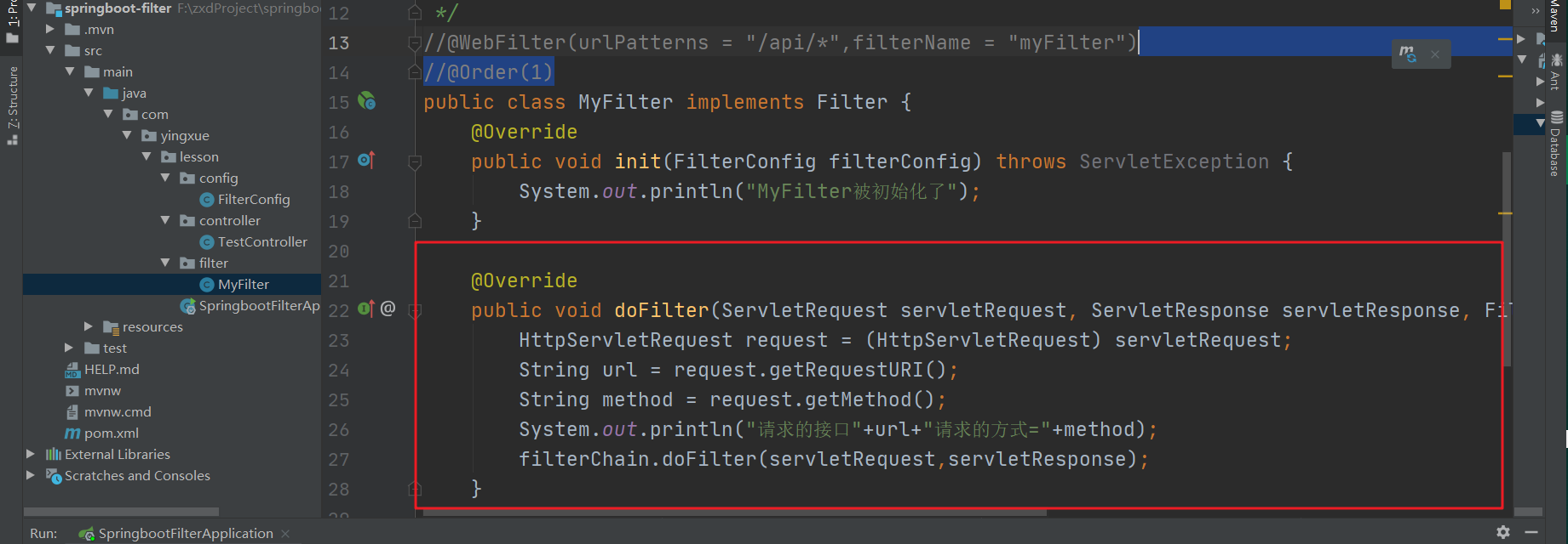 (a)写一个filter和上面一些只不过去掉了webFilter和Order和在启动类中去掉ServletComponentScan