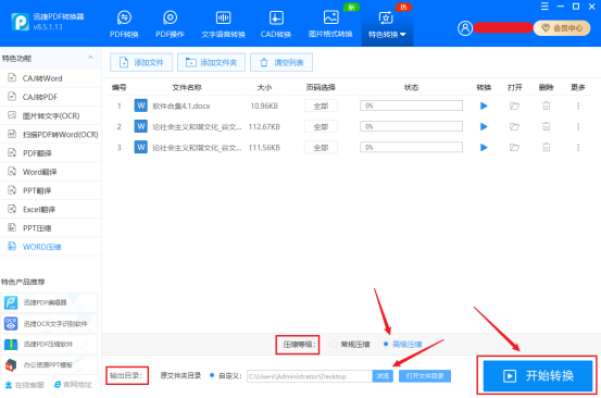 导入完成之后,在页面底部调整压缩等级和输出目录,压缩等级分为常规压缩和高级压缩,压缩的只是文档的大小和占用空间,对文档本身的质量不会产生太大影响。