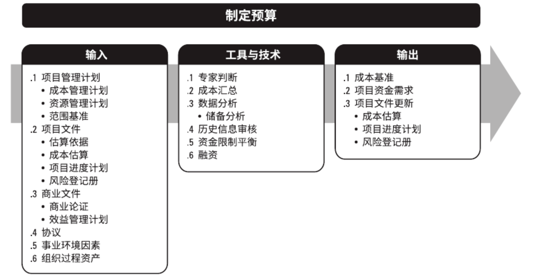 定义:制定预算是汇总所有单个活动或工作包的估算成本,建立一个经批准的成本基准的过程。