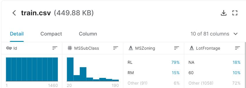 这里选用kaggle上的入门比赛,Housing Prices Competition for Kaggle Learn Users的数据集作为实验对象,这是一个预测房价的回归问题,数据集如下: