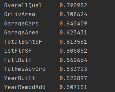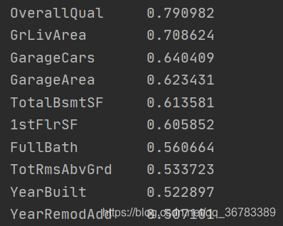 #[:11],选出11个是因为SalePrice自己与自己的相关性最高,所以要将它去除故选择排序后的前11个属性,再去除SalePrice