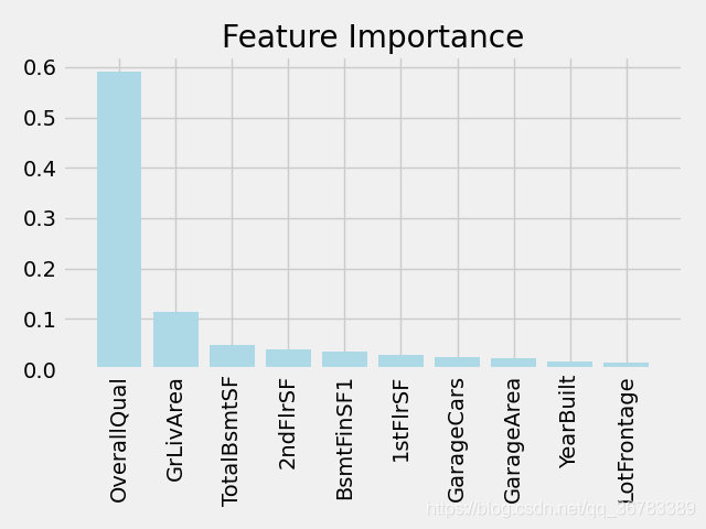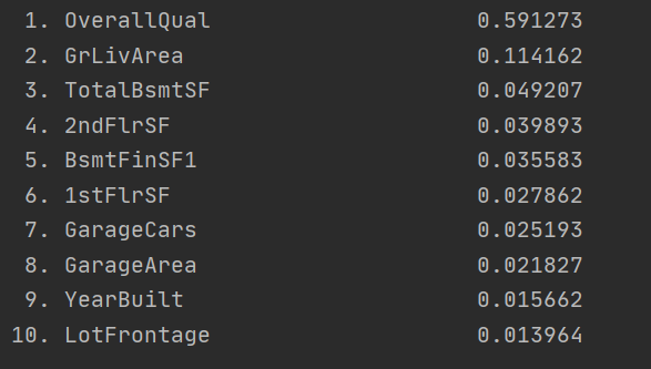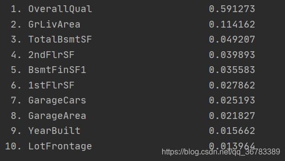 可以看出,步骤2与步骤1中选择出来的属性列差别不大,不过步骤2表明随机森林模型在拟合后觉得OverallQual属性列的重要性很高。