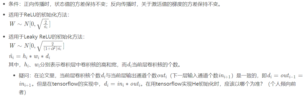 - 条件:正向传播时,激活值的方差保持不变;反向传播时,关于状态值的梯度的方差保持不变。