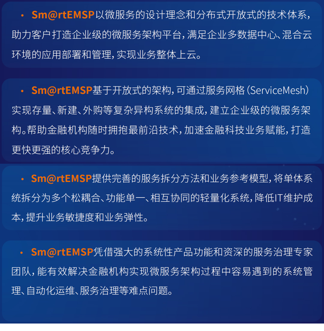 产品功能完善、性能更优、部署更快、扩展性更强、安全稳固,帮助金融机构迅速打造微服务化、自动化、智能化和云化的企业级分布式架构体系。Sm@rtEMSP已在国内多家金融机构落地实施并获得市场的高度认可。