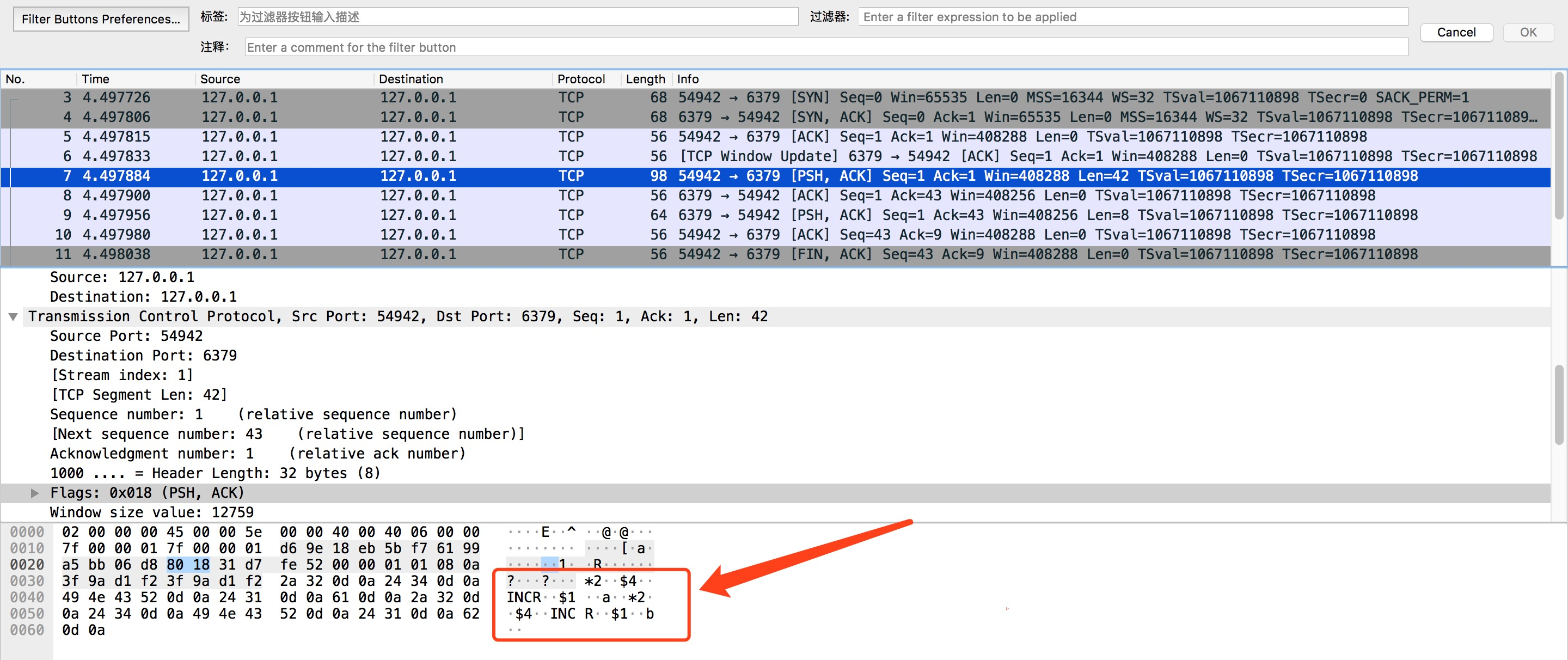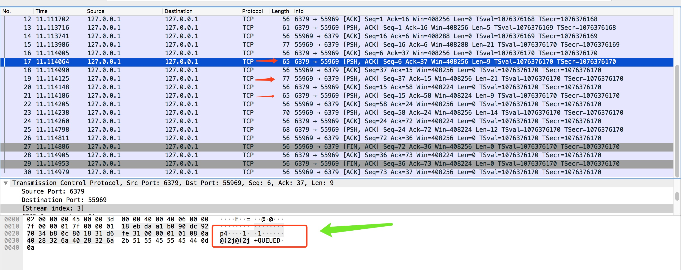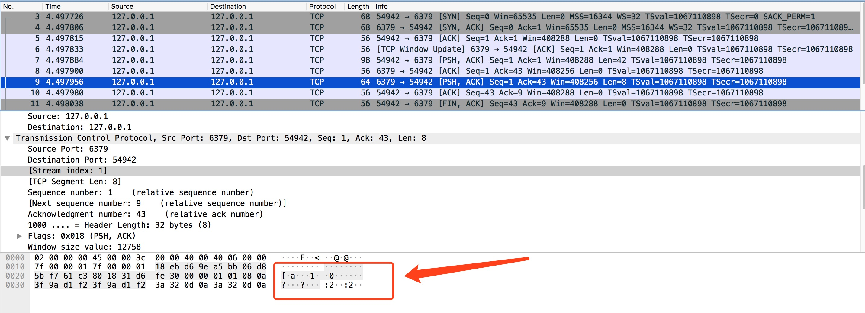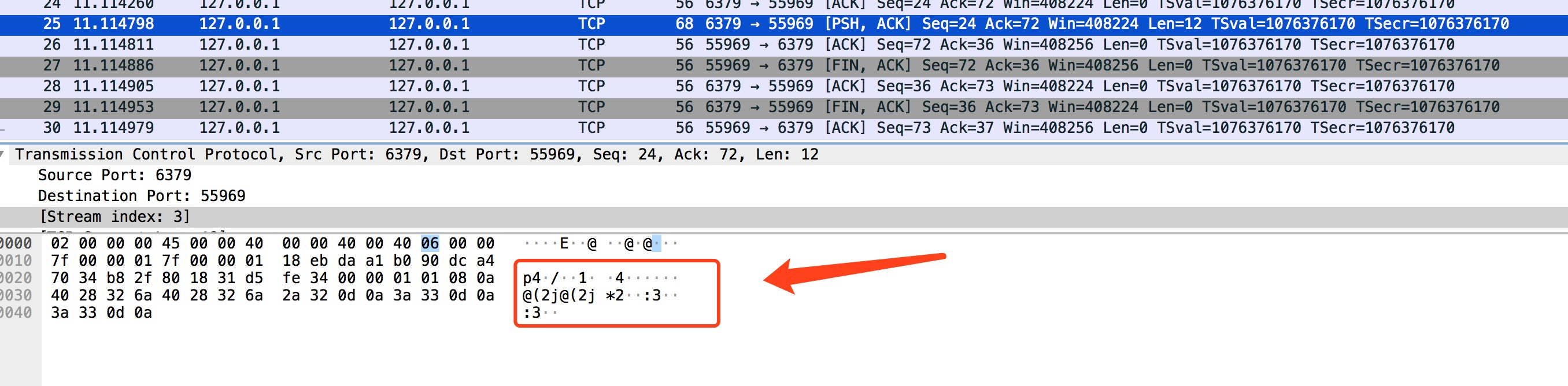 为了查看这期间具体的连接过程,用wireshark监听回环地址端口6379,抓包请求如下图所示: