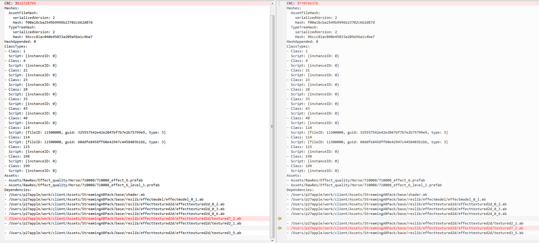 对比Manifest文件,确认Dependencies所依赖的AssetBundle包没有变化, 只是顺序发生了变化。所以是什么原因导致两次出包会有差异呢?