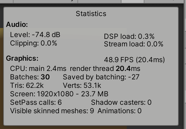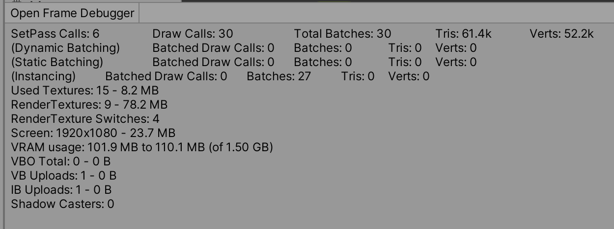 所有的材质都开启了Instance。首先从最后渲染效果达到目标,没有问题。但是观察合批数据,觉得有点疑惑: