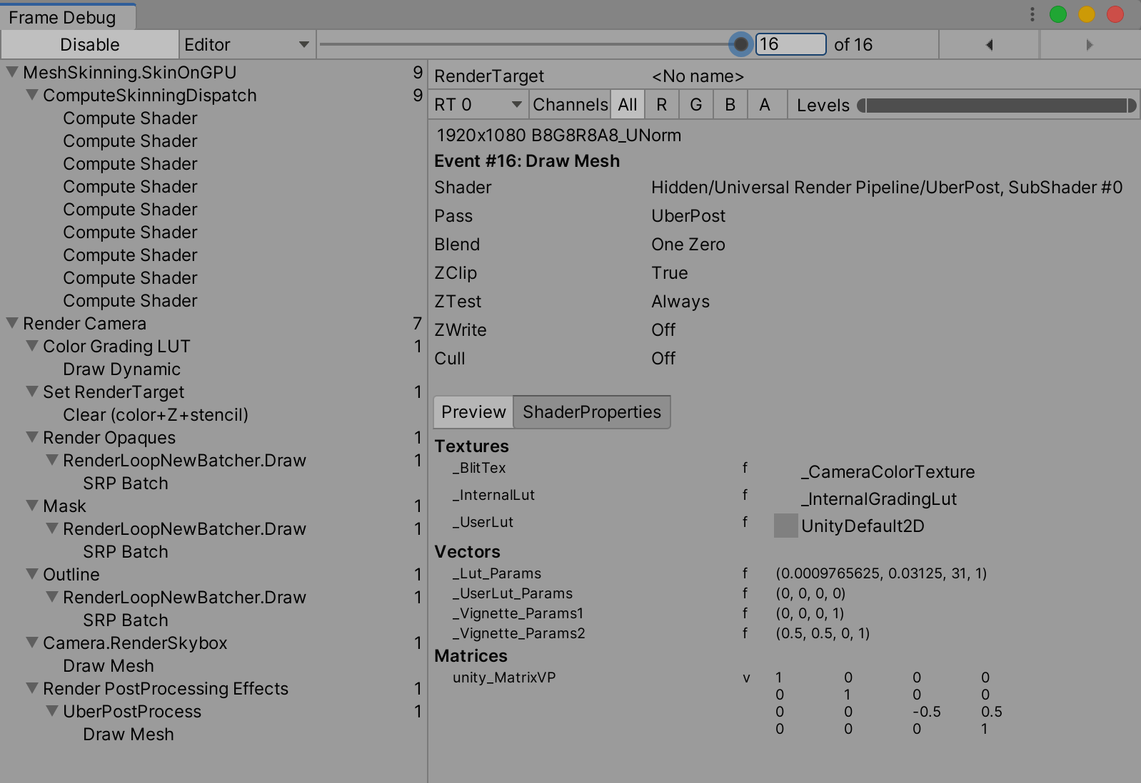 但是从Frame Debugger观察,角色渲染的3个Pass都进行了SRP Batch,一共16个批次。