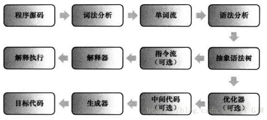 对于应用程序而言,大部分的程序代码到物理机的目标代码或虚拟机能执行的指令集之前,都需要经过下图所示的步骤。