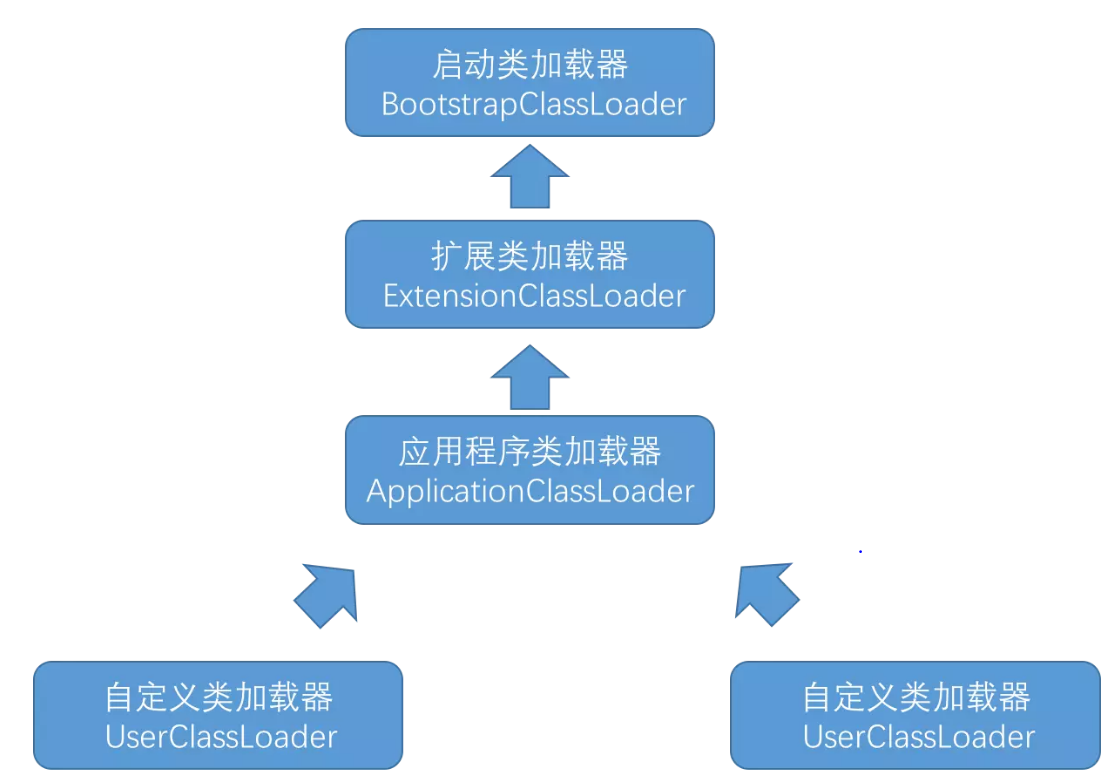 2)如果父类加载器还存在其父类加载器,则进一步向上委托,依次递归,请求最终将到达顶层的启动类加载器。