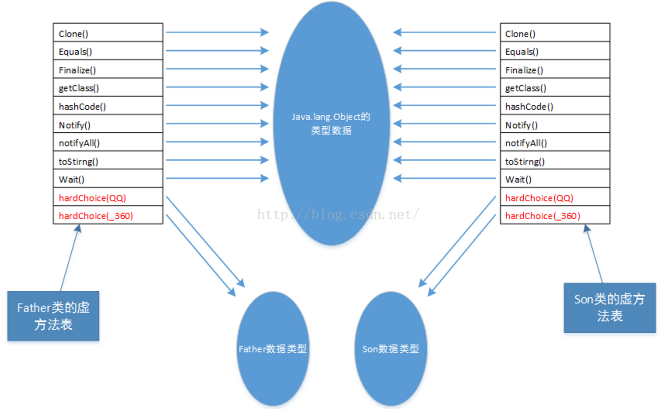 图中,Son重写了来自Father的全部方法,因此Son的方法表没有指向Father类型数据的箭头;但Son和Father都没有重写来自Object的方法,所以它们的方法表中所有从Object继承来的方法都指向了Object的数据类型。