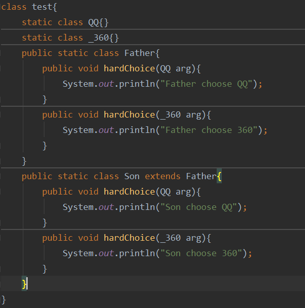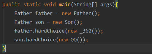在执行son.hardChoice(new QQ())这句代码时,由于静态分配过程中已经知道函数必须是hardChoice(QQ arg),其中参数的类型编译器不会关心,只会在意方法的接收者到底是Father还是Son。