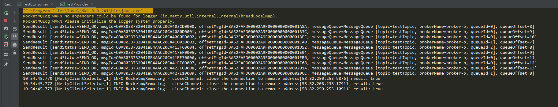 ========>>>> provider 生产者代码: public class TestProvider { public static void main(String[] args) { try { //Instantiate with a producer group name. DefaultMQProducer producer = new DefaultMQProducer("p1"); // Specify name server addresses. producer.setNamesrvAddr("43.230.143.17:9876;58.82.250.253:9876;58.82.208.238:9876"); //Launch the instance. producer.start(); for (int i = 0; i < 10; i++) { //Create a message instance, specifying topic, tag and message body. Message msg = new Message( "testTopic" /* Topic */, "TagA" /* Tag */, ("Hello RocketMQ " + i).getBytes(RemotingHelper.DEFAULT_CHARSET) /* Message body */ ); //Call send message to deliver message to one of brokers. SendResult sendResult = producer.send(msg); System.out.printf("%s%n", sendResult); Thread.sleep(1000); } //Shut down once the producer instance is not longer in use. producer.shutdown(); } catch (Exception e) { e.printStackTrace(); } } } ========>>>> consumer 消费者代码: public class TestConsumer { public static void main(String[] args) { try { // Instantiate with specified consumer group name. DefaultMQPushConsumer consumer = new DefaultMQPushConsumer("c1"); // Specify name server addresses. consumer.setNamesrvAddr("58.82.250.253:9876;43.230.143.17:9876;58.82.208.238:9876"); // Subscribe one more more topics to consume. consumer.subscribe("testTopic", "*"); // Register callback to execute on arrival of messages fetched from brokers. consumer.registerMessageListener((MessageListenerConcurrently)(msgs, context) -> { // System.out.printf("%s Receive New Messages: %s %n", Thread.currentThread().getName(), msgs.toString()); System.out.println(" Receive New Messages: " + Arrays.toString(msgs.toArray())); return ConsumeConcurrentlyStatus.CONSUME_SUCCESS; }); //Launch the consumer instance. consumer.start(); System.out.printf("Consumer Started.%n"); } catch (Exception e) { e.printStackTrace(); } } }