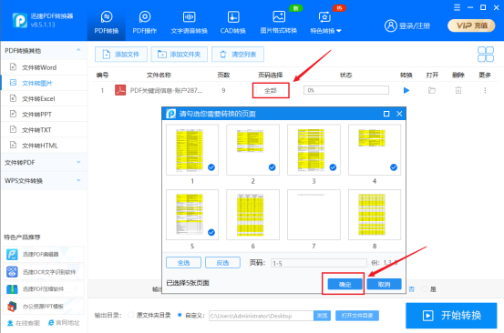 PDF文件导入好之后,点击页码选择下方的全部,对PDF文件中的页面进行选择,将不需要转换的页面取消勾选,点击确定。