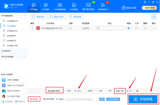 然后在页面下方调整输出图片格式,选择我们需要的PNG格式,由于我们需要进行转换的页面较多,所以在合成一张的选项中我们选择“否,”将需要转换的PDF页面转换成单张独立的PNG图片,调整输出目录。