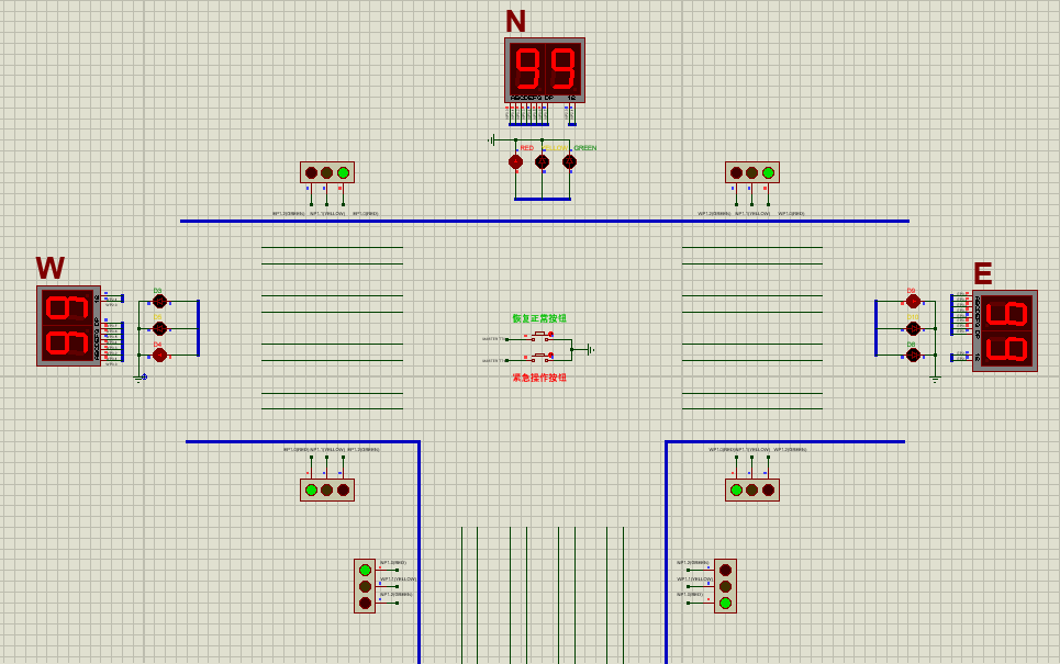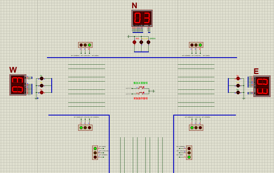 项目要求:用单片机设计一套丁字路口的交通灯显示系统,如图所示,有三组相同的道路显示系统