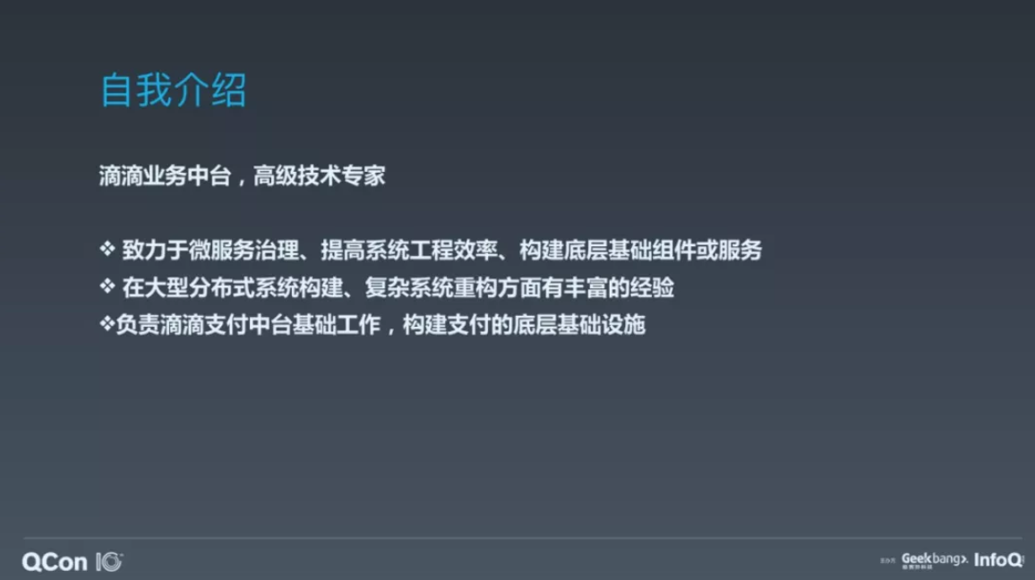 何修峰,就职于滴滴业务中台,任高级技术专家一职,致力于微服务治理、提高系统工程效率、构建底层基础组件或服务,在大型分布式系统构建、微服务治理、复杂系统重构方面有丰富的经验,现负责滴滴支付中台基础工作,构建支付的底层基础设施,以打造稳定、高效、可扩展的支付底层能力为己任,提高工程效率,助力集团各业务线快速发展。