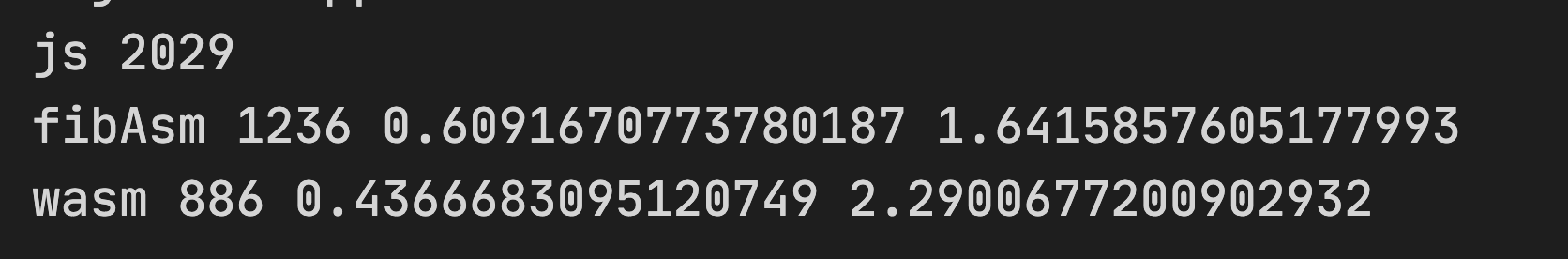 console.log(i, 'js asm cpp', fibJs(i), fibAsm(i), fibWasm(i))
