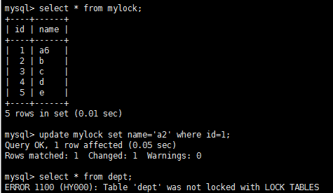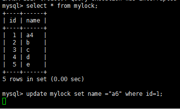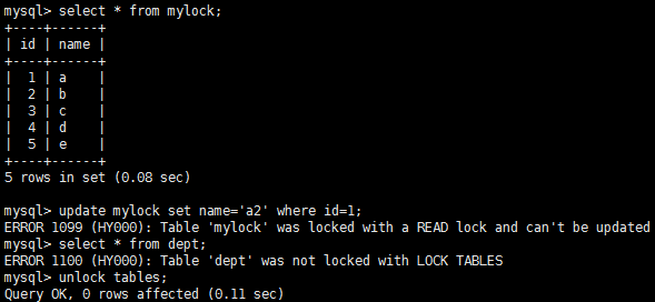 1.update mylock set name='a2' where id=1; 不能更新该表