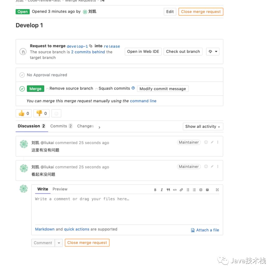 无问题可以点击merge通过或者不通过则点击右下角的close merge request。